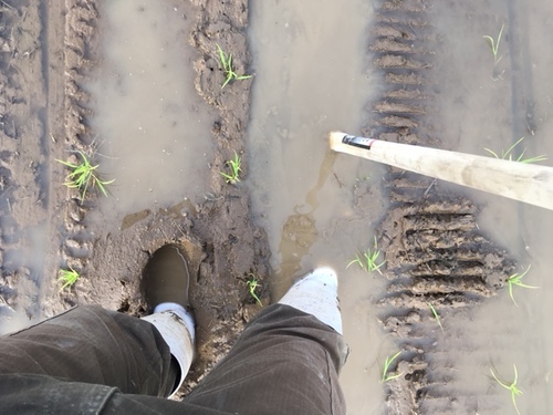 師匠の田植機が土を掘ってしまった跡を鍬で修正。
